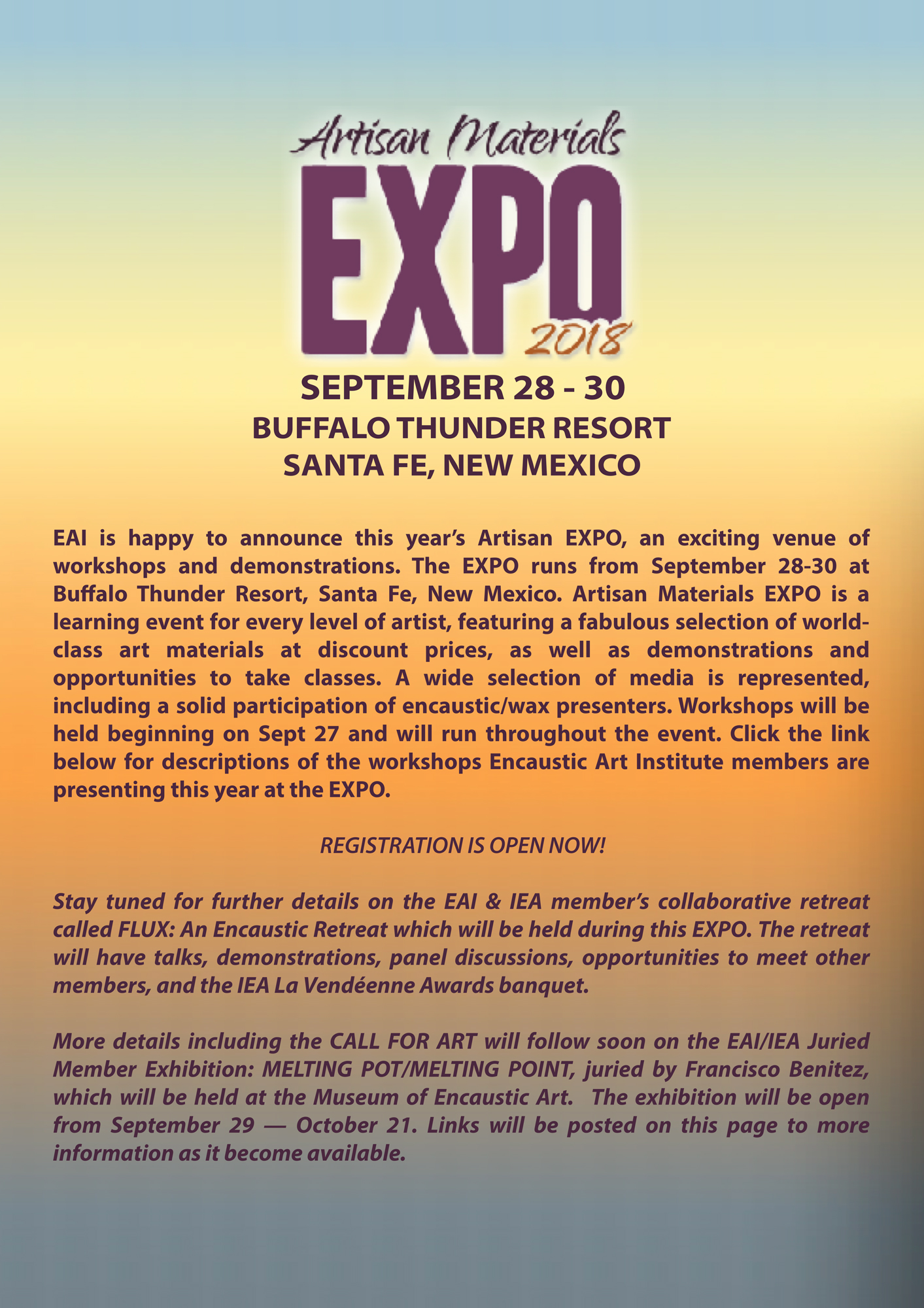 Click HERE for descriptions of the workshops Encaustic Art Institute members are presenting this year at the EXPO.