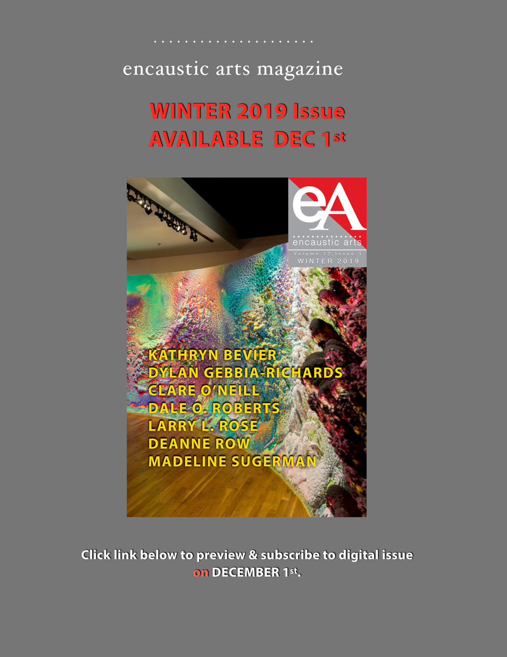The WINTER 2019 Issue of Encaustic Arts Magazine is available now! The preview link to subscribe to this issue has been posted to the magazine page of the website.