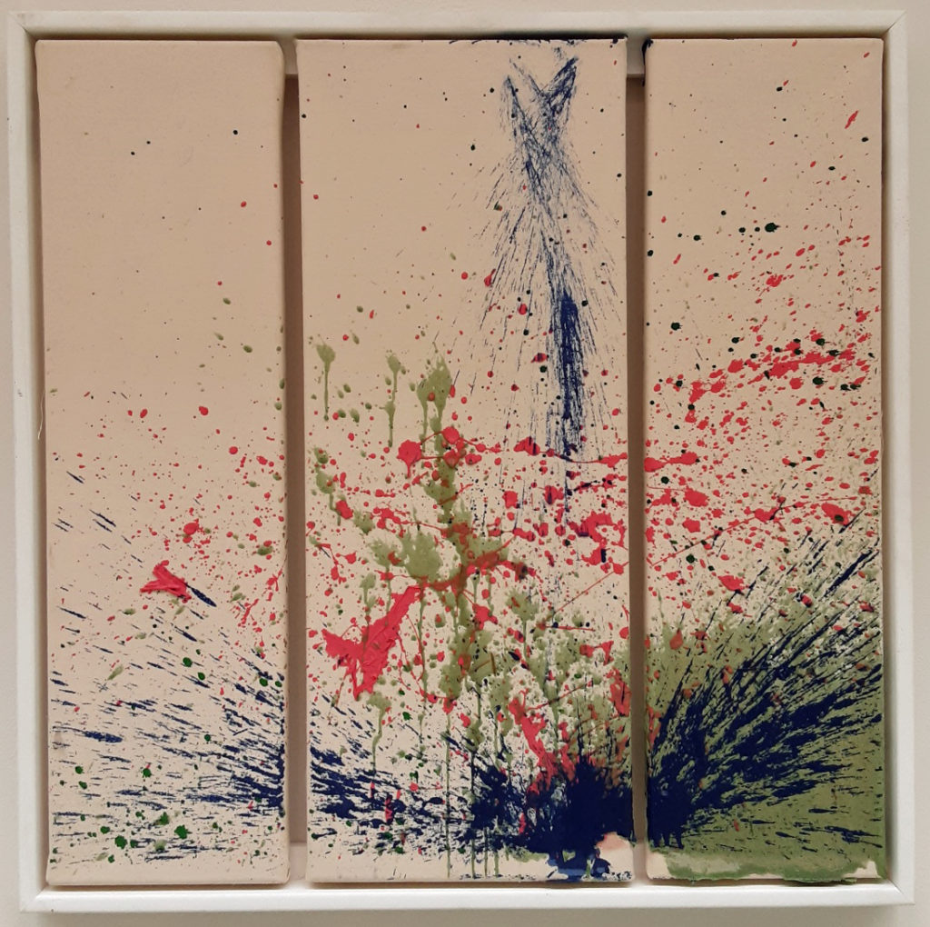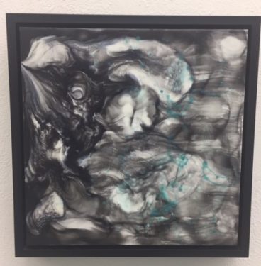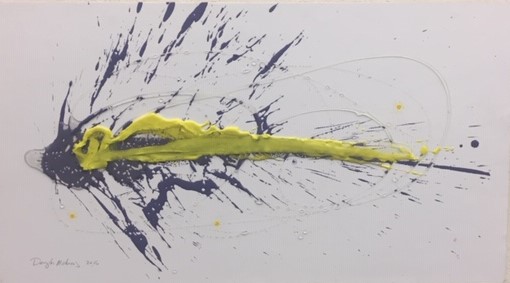 “Particle Explosion #12”, wax, polyurethane resin on mounted watercolor paper, 21 x 27 inches