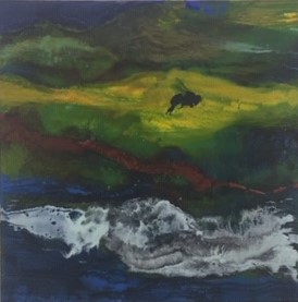 “Paddling”, encaustic on wood, 10 x 10 inches