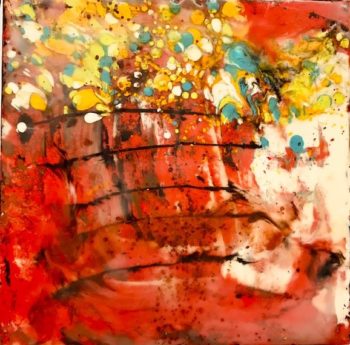 “5 Infernos”, encaustic on wood, 10 x 10 inches