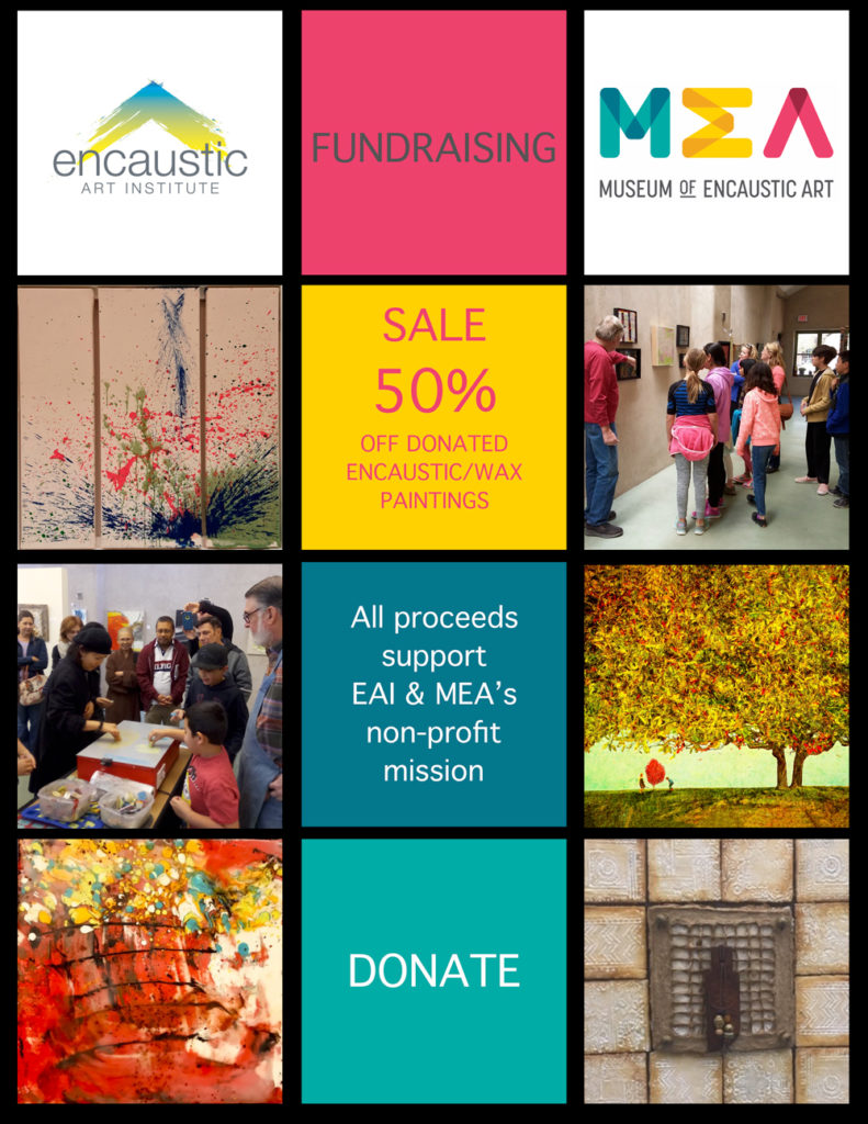 YOUR SUPPORT: We are asking for your help by supporting us in our commitment to expand art education to all ages, including free art workshops to children 6-16, and to bring the encaustic/wax art movement to the second largest art market in the nation. With EAI’s gallery, artwork from over 200 members’ nation-wide can be viewed and purchased, as well as over 300 encaustic/wax works collected to form the Permanent Collection in the Museum of Encaustic Art – the only one in the nation.