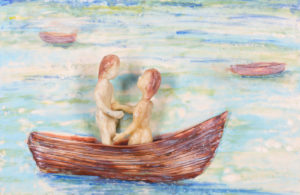“Conversation in a Boat”, encaustic on board, with clay and cast encaustic, 12 x 18 inches