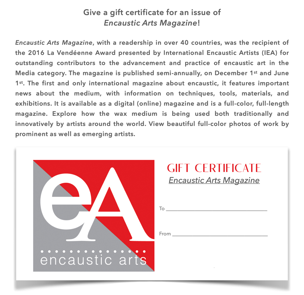To give a gift certificate for the digital (online) current issue or one of our back issues: Click the Add to Cart button below. The shopping cart will open just below. Click the yellow checkout with PayPal button to complete your payment. Then email us, with your name, the recipient’s name, and email address, and we will send you the gift certificate which you can print out and give to the recipient or email to the recipient. Or send a check payable to the Encaustic Art Institute with the above information to Encaustic Art Institute 18 County Rd 55A, Cerrillos, NM 87010.