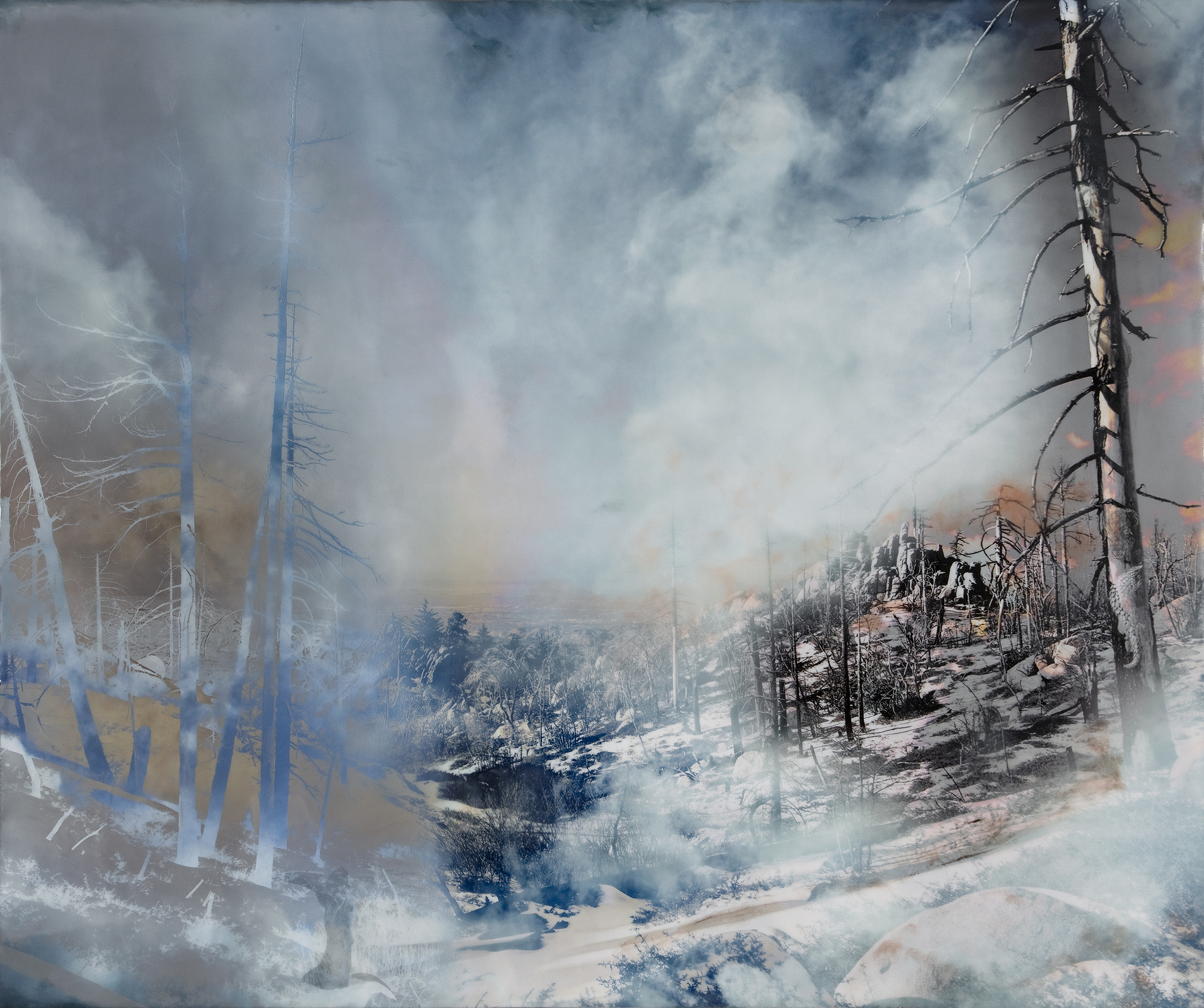 End of Days, encaustic, archival ink, photo, oils, on wood panel, 20 x 24 inches