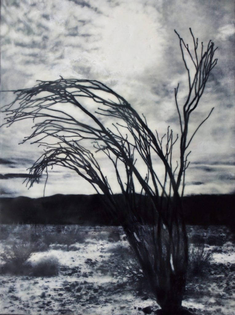 Scorched Desert Ocotillo, photo encaustic with dry pigments on birch cradled panel, 16 x 12 inches, float frame (18 x 14 inches, framed)