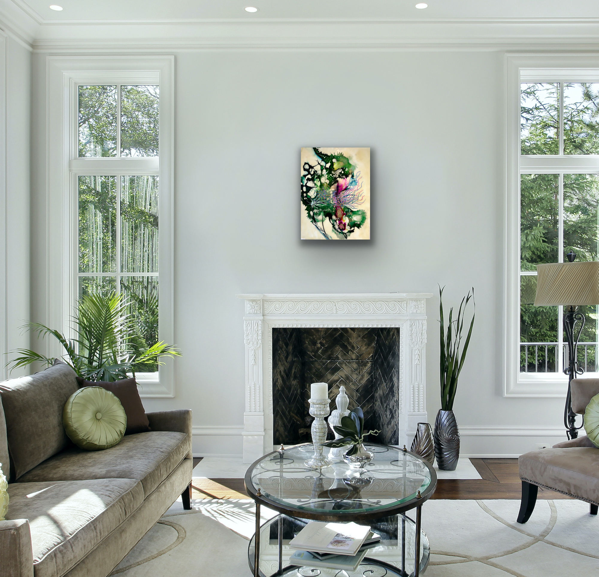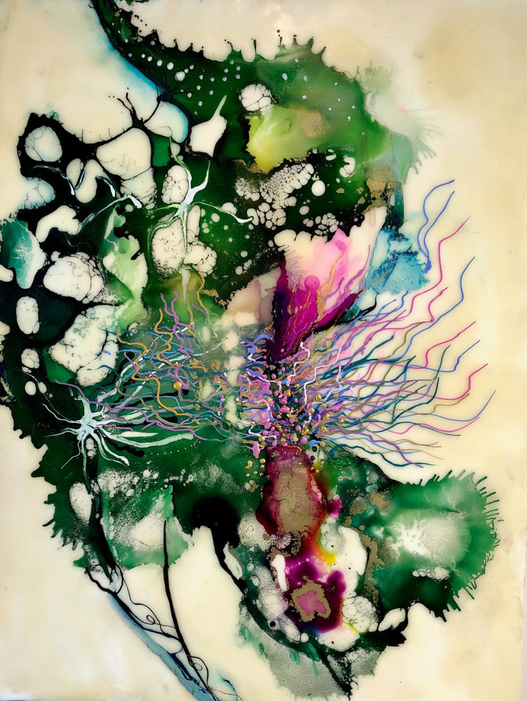 This painting depicts that liminal place of juxtaposition where a body of water meets the surface of the air. The captivating beauty of algae rises above the water, and its distorted reflection below mirrors the future growth of the planet.
