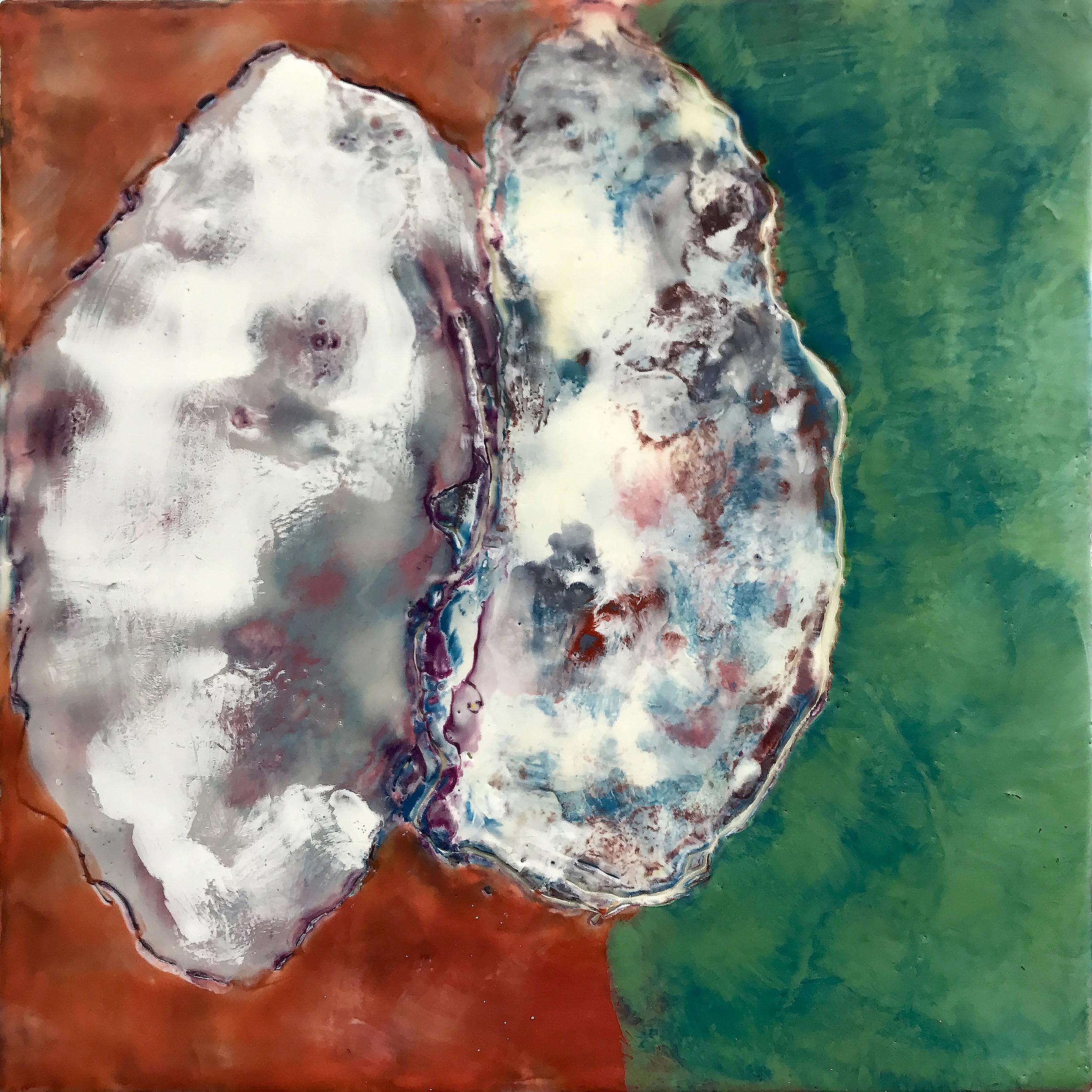 Oyster Shell Couple Red & Green, encaustic on panel