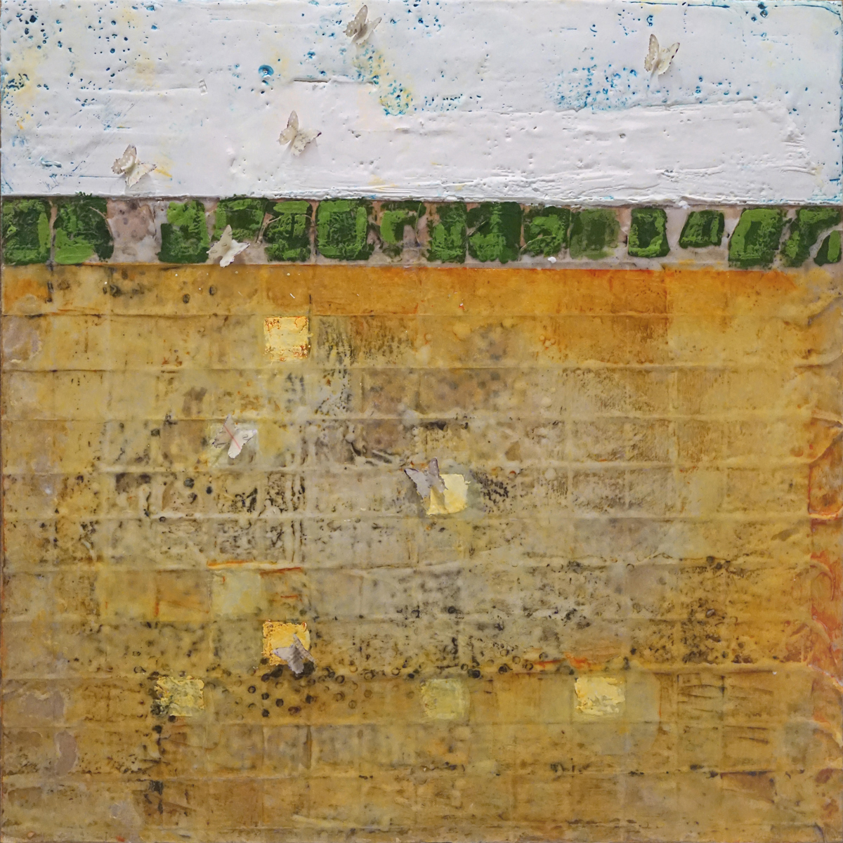 Seeds, encaustic, mixed media, oil paint stick, on cradled birch panel, 24 x 24 x 2 inches
