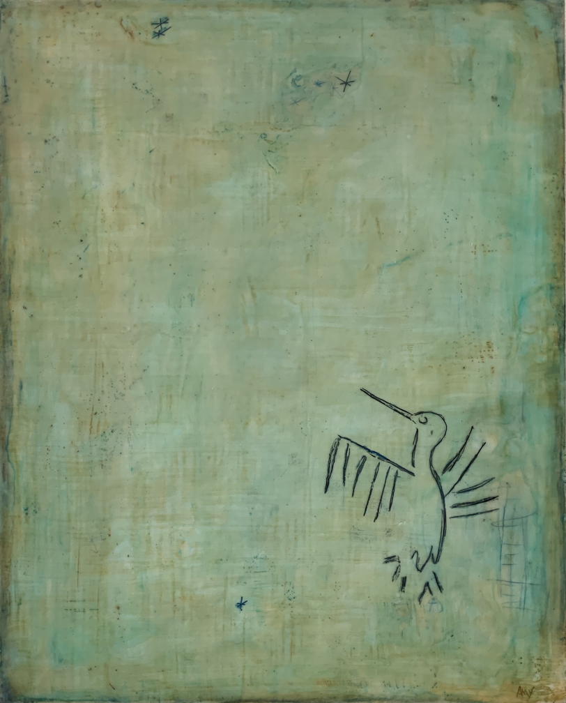 Hummingbird Returns, encaustic, oil paint, 20 x 16 inches