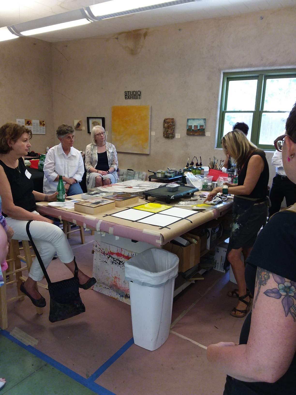 From noon to 2:30, Catherine Trapani demonstrated cold wax and oil technique. She pulled a good sized audience and kept them captivated. Catherine offers a workshop at the Encaustic Art Institute the remainder of the summer and next fall.