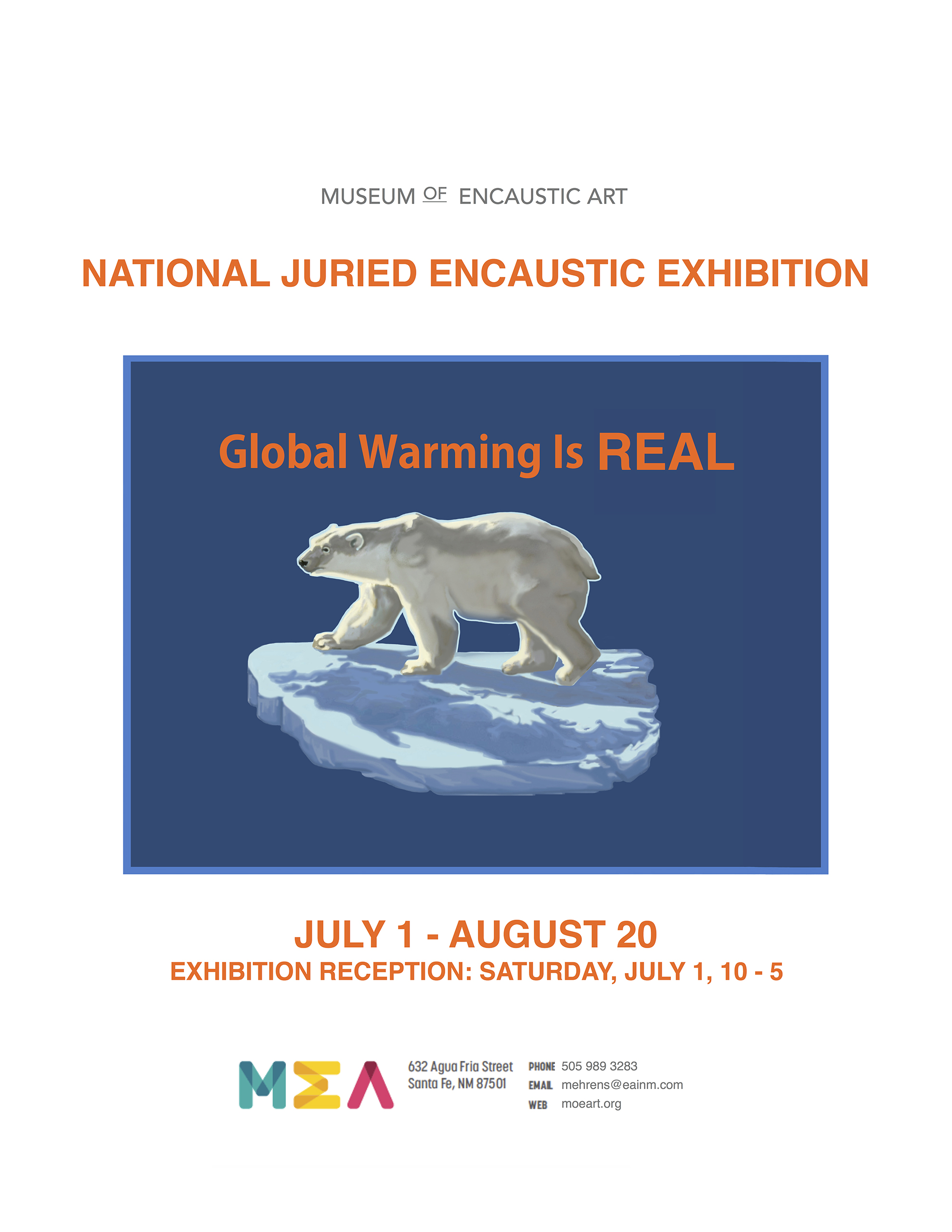 The Museum of Encaustic Art’s National Juried Encaustic Exhibition on the theme “Global Warming is REAL” runs from July 1- August 20 at the Museum of Encaustic Art, 632 Agua Fria St, Santa Fe, NM. The exhibition reception is on Saturday, July 1 from 10 – 5 pm. One hundred and six artists entered a wide array of work based on the theme of global warming. We are very pleased that so many artists were inspired by the theme of the exhibition. Thank you to all the entrants! The jury process was highly selective. The juror, Garrett Smith, chose 37 pieces to be juried into the exhibit. Congratulations to the winning entrants! The exhibit will feature the work of the following artists: