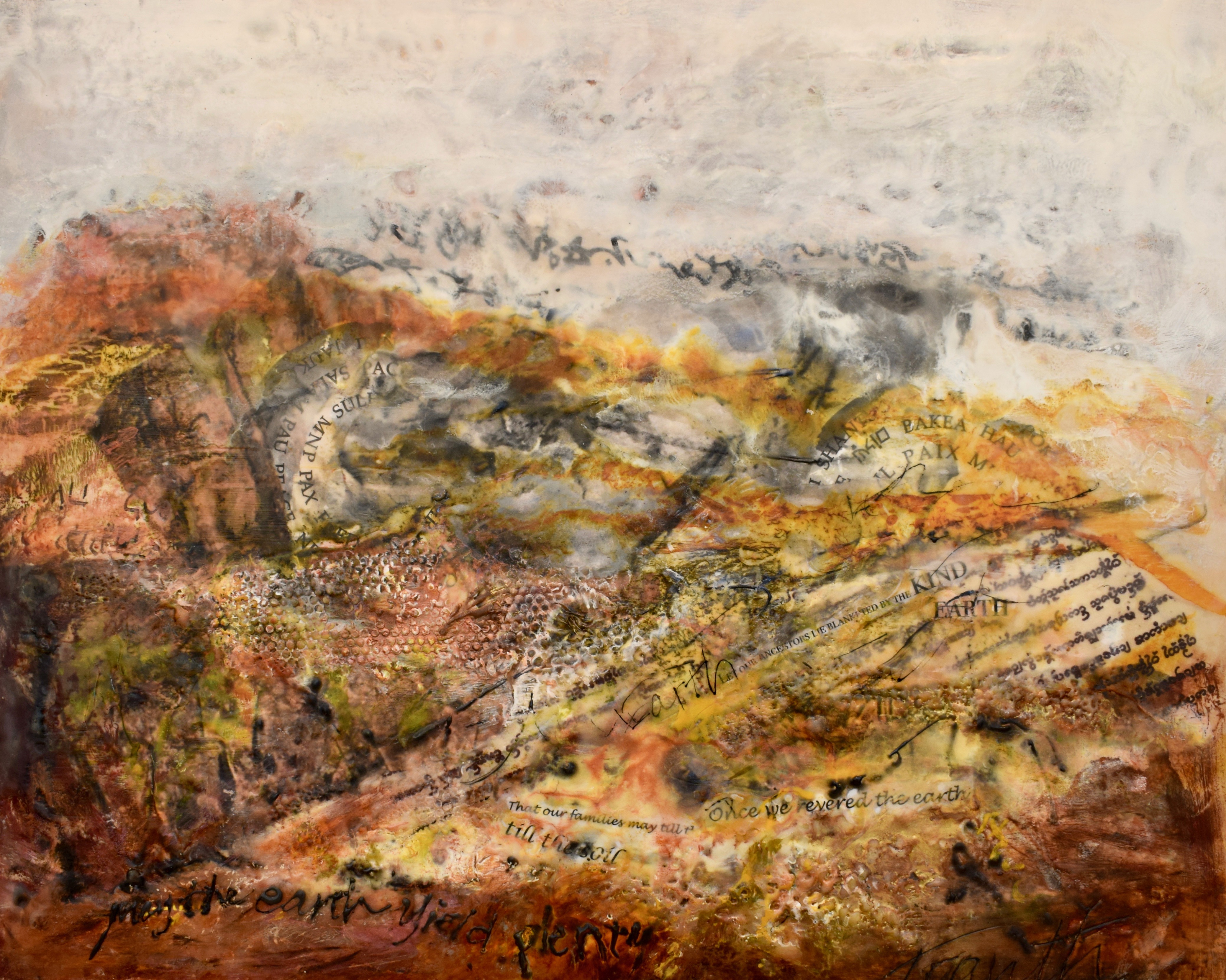 Once We Revered the Earth, encaustic, shellac, India ink, alcohol ink, collage, on wood panel
