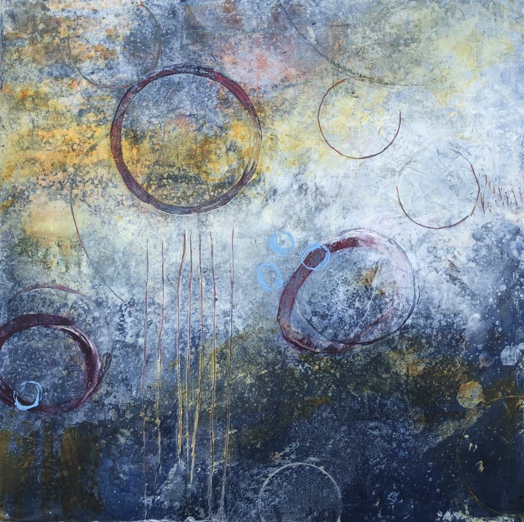 Global Tears, cold wax, oil sticks, stencils, on cradled board