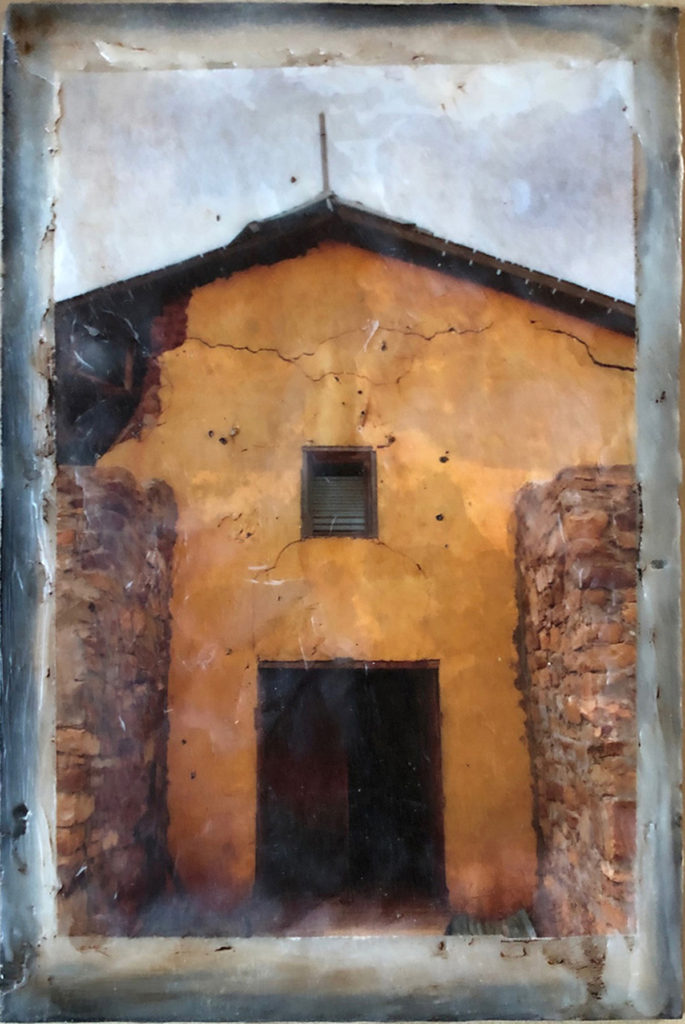 Capilla, Colonias, New Mexico, photo encaustic on hardboard, hot wax, with embedded tea grounds, 8.5 x 7.5 inches
