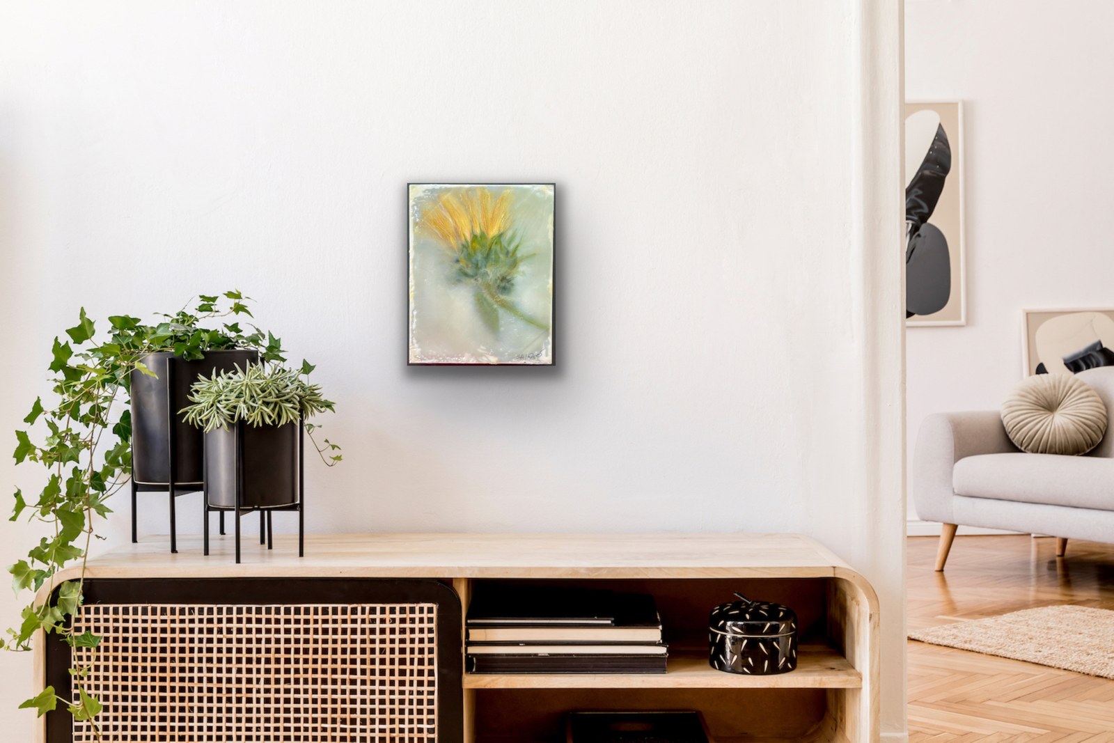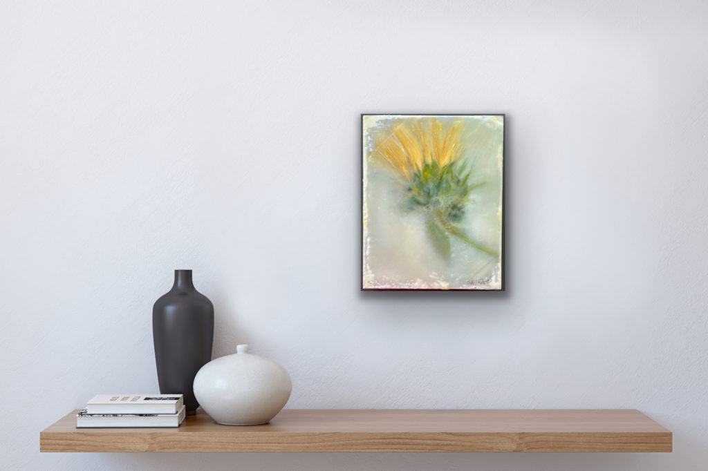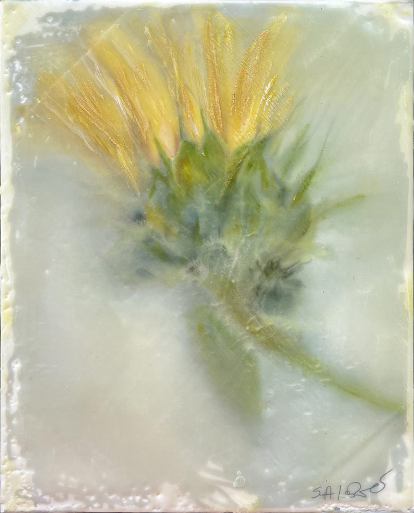 Buoyant, photo encaustic wax painted with pigment sticks and metallic gold (for some sparkle) with a few nicks and scrapes (because it’s been a rough year) on a wood shadow box, 10 x 8 x 1 inches