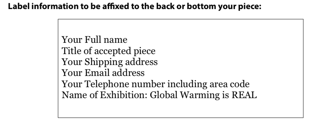 Pricing and sales: Updated information regarding sales for Global Warming is REAL exhibition: Last year we had several requests for pricing information, so we kept a list of prices available on request. This year, we will post signs throughout the exhibit, that some artwork is for sale, and to request that information.
