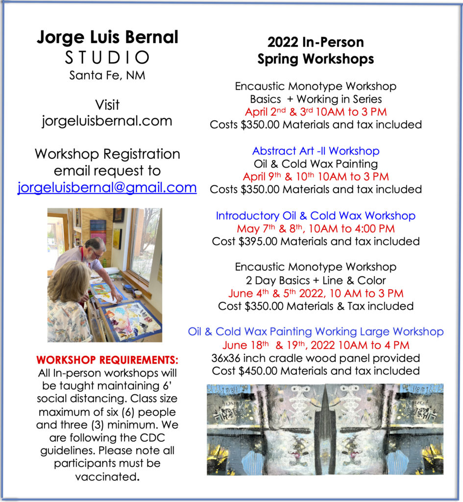 Instructor Jorge Luis Bernal will be offering the following workshops at his studio in Santa Fe. For information visit his website. To register, contact Jorge.